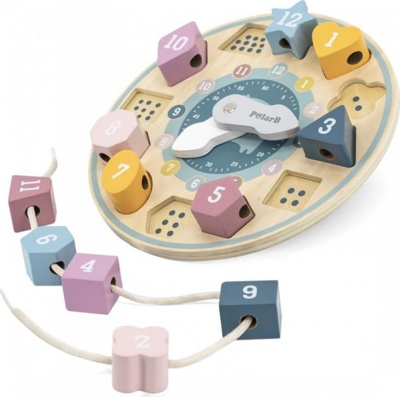 Zegar ze słonikiem to zabawka łącząca przyjemne z pożytecznym. Dziecko z łatwością będzie mogło podjąć pierwsze kroki w nauce odczytywania godzin na klasycznym zegarze, a jednocześnie nawlekać kolorowe klocki na sznurek
