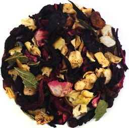 Mieszanka owoców , rodzynek , jabłka , poziomki z płatkami hibiskusa o poziomkowo-waniliowymaromacie. Herbata owocowa o wspaniałym smaku poziomek....