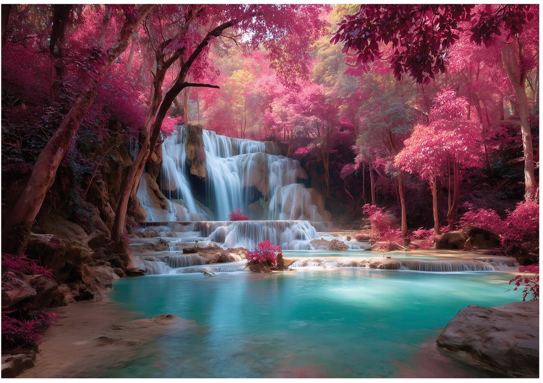 Fototapeta od marki Wallarena wyróżnia się wysoką jakością wykonania oraz estetyką. Dzięki zastosowaniu flizeliny, produkt jest nie tylko trwały, ale także łatwy w montażu. Motyw wodospadu w lesie wprowadza do wnętrza elementy natury, co sprawia, że staje się ono bardziej przytulne i relaksujące. Gama kolorystyczna obejmująca niebieski, odcienie brązu, beżu, różu oraz zieleni sprawia, że fototapeta doskonale komponuje się z różnorodnymi stylami aranżacyjnymi.