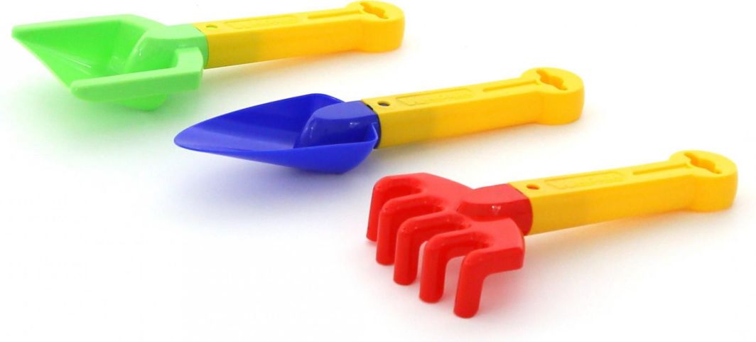 Zestaw do zabawy w piasku zawierający łopatkę, szufelkę oraz grabki.