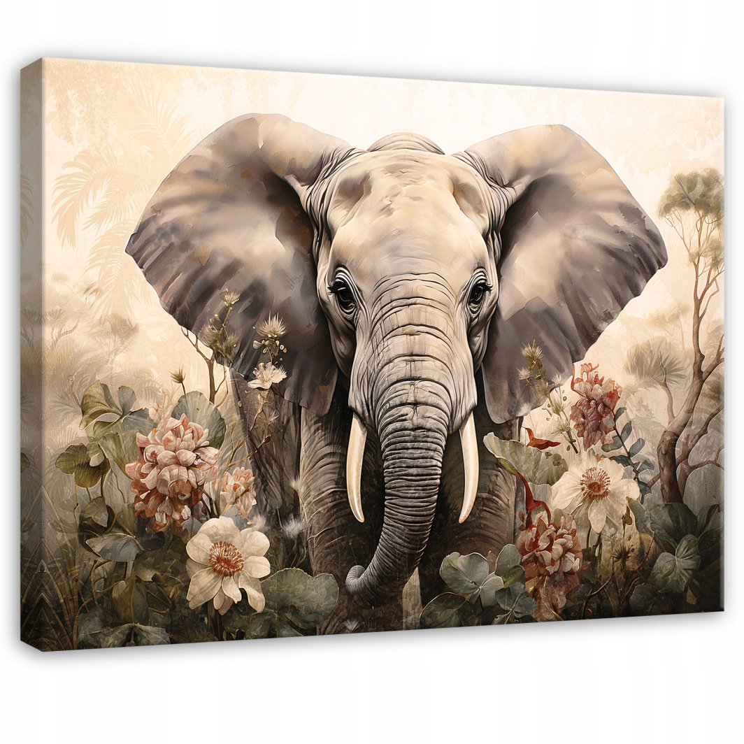 Obraz na płótnie przedstawiający słonia w otoczeniu kwiatów to znakomity wybór do dekoracji pokoju dziecięcego. Jego wymiary 60x40 cm sprawiają, że doskonale wpasuje się w różnorodne przestrzenie, wprowadzając do nich przytulność i radość. Ten urokliwy motyw zwierzęcy z pewnością przypadnie do gustu najmłodszym, tworząc w ich otoczeniu przyjemną atmosferę.
