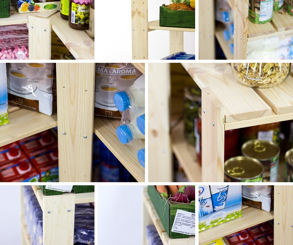Na całej długości nóg w rozstawie co 13 cm, znajdują się otwory montażowe umożliwiające modyfikację odległości między piętrami, stosownie do potrzeb.