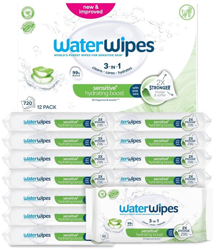 WaterWipes WaterWipes Sensitive+ Nawilżający Zastrzyk chusteczki łagodzące z aloesem 12x60szt.