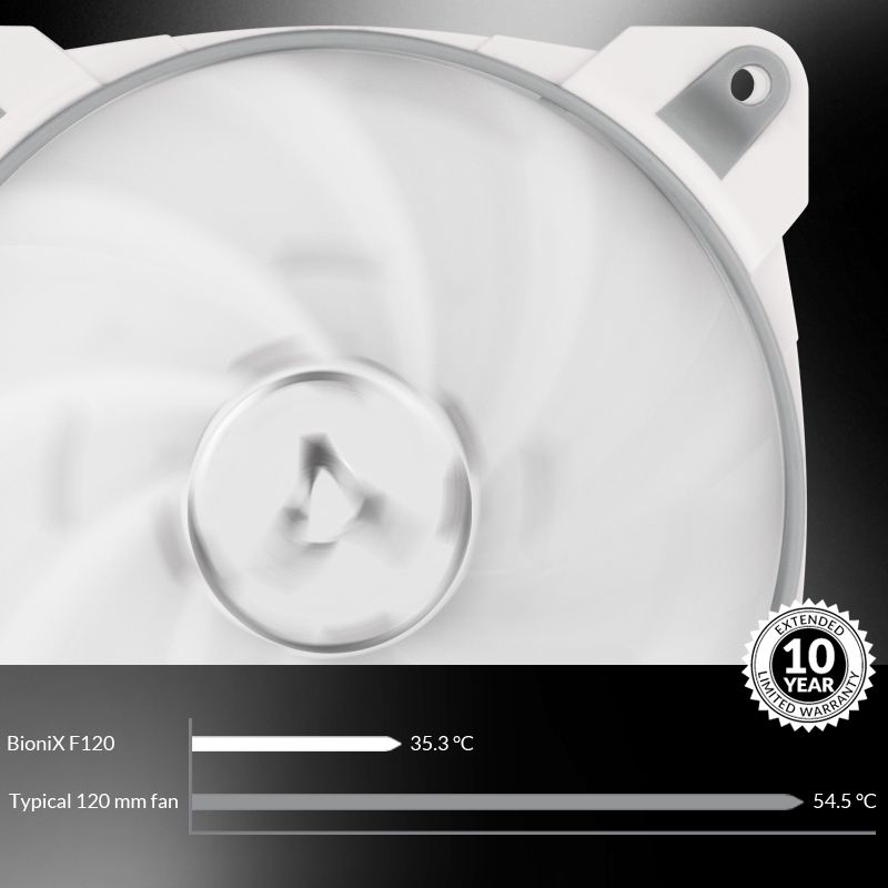Niższa o 10°C temperatura silnika podwaja żywotność. Wentylatory do gier BioniX mają czterokrotnie dłuższą żywotność dzięki niskiej temperaturze cewki. Dlatego przedłużamy gwarancję do 10 lat.