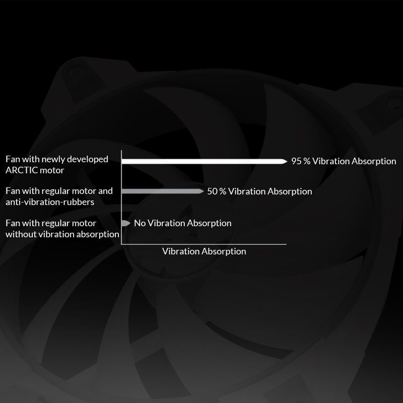 Niezwykle cicha praca dzięki nowo opracowanemu silnikowi gwarantuje długie sesje bez irytującego hałasu. Nowy silnik ARCTIC w wentylatorach BioniX eliminuje wibracje bezpośrednio u źródła, w szczególności przy silniku. Silnik ARCTIC pochłania 95% wibracji w porównaniu do konwencjonalnego silnika prądu stałego. Dzięki temu nie ma potrzeby stosowania gumowych podkładek dystansowych ze względu na stały moment obrotowy i płynniejsze przełączanie pola magnetycznego.