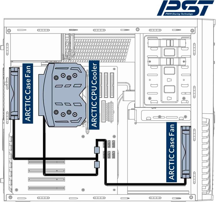 Jeśli chcesz poprawić wydajność chłodzenia komputera, otrzymasz kilka wentylatorów pracujących równolegle (ponieważ potrzeba 10 wentylatorów, aby podwoić poziom hałasu). Ale w czym to pomoże, jeśli nie współpracują ze sobą? PST zapewnia, że wszystkie wentylatory słuchają jednego sygnału sterującego. Na przykład. współdzielisz sygnał PWM Cooler CPU i zapewniasz, że wentylatory obudowy stoją przy niskim obciążeniu i włączają się, gdy jest to konieczne.