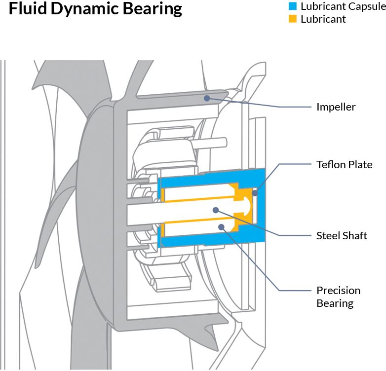 Innowacyjna konstrukcja łopatek wentylatora poprawia przepływ powietrza i ułatwia bardzo wydajną wentylację. Wirnik został zaprojektowany z naciskiem na minimalizację poziomu hałasu przy jednoczesnym zapewnieniu pożądanego przepływu powietrza i ciśnienia. Łożysko Fluid Dynamic jest dostarczane z kapsułką olejową, która zapobiega wyciekom smaru. Dzięki temu łożysko to jest równie ciche jak łożysko ślizgowe, ale ma znacznie dłuższą żywotność. Funkcja PWM pozwala płycie głównej na precyzyjne uruchamianie wentylatora z wymaganą prędkością. Gwarantuje to wymagane chłodzenie i minimalizuje poziom hałasu.
