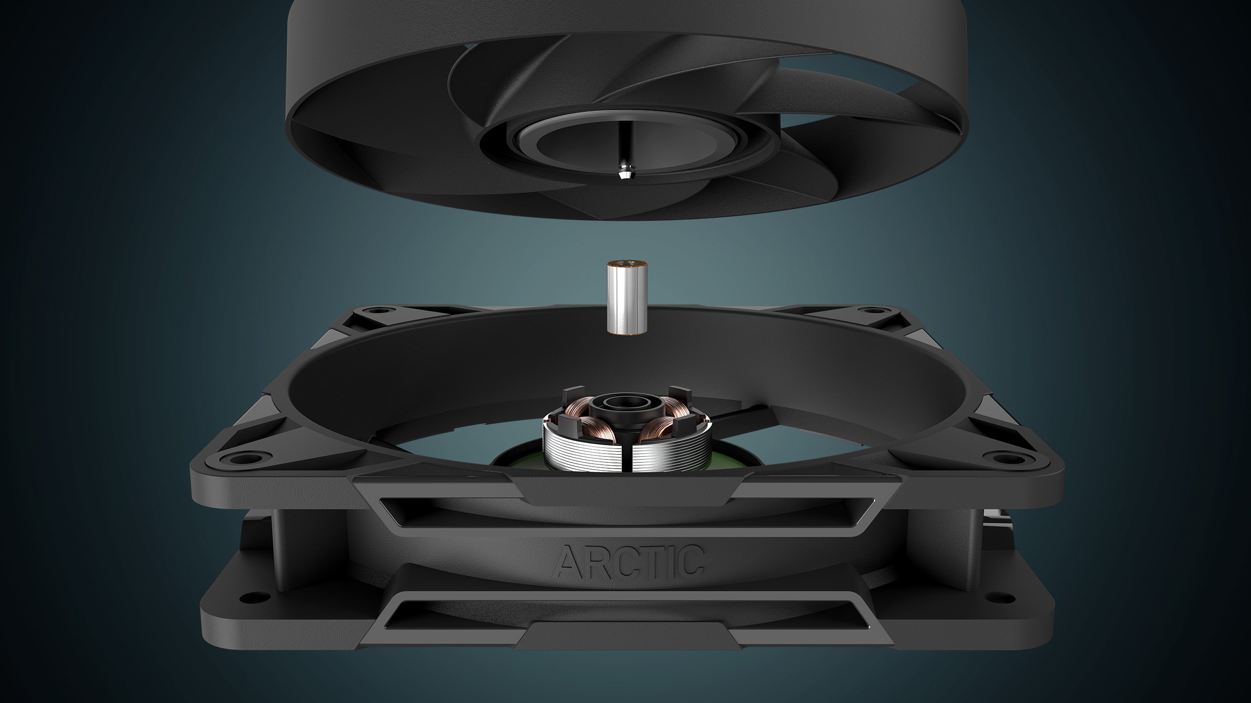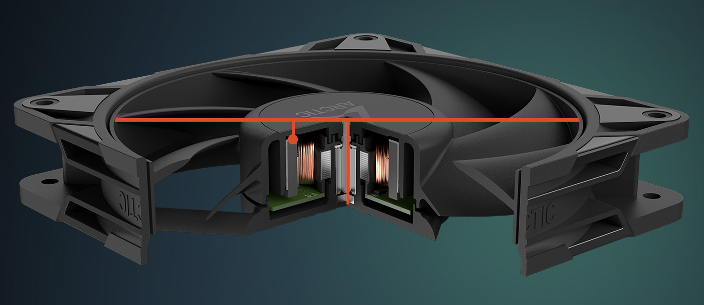 Wentylator zapewnia wyższą wydajność przy niskich prędkościach, z większym przepływem powietrza i ciśnieniem statycznym, generując przy tym zaledwie 25 dB(A) – idealne dla cichego, ale potężnego chłodzenia.