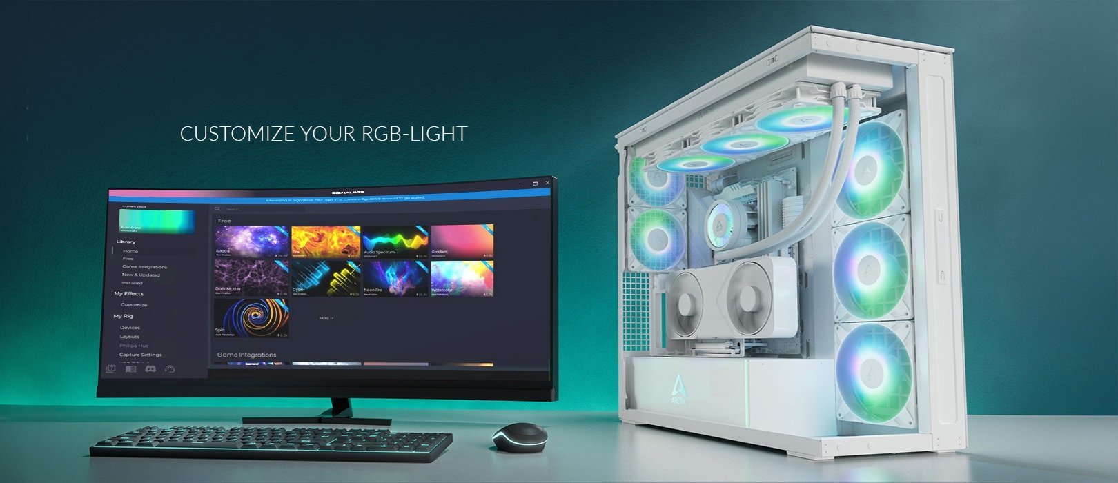 Model ten współpracuje z oprogramowaniem SignalRGB, co pozwala na zaawansowaną konfigurację efektów świetlnych. Produkty ARCTIC są wstępnie skonfigurowane w aplikacji, co ułatwia synchronizację oświetlenia z innymi podzespołami, niezależnie od ich producenta (rozwiązanie Hardware-Independent). Użytkownik zyskuje dostęp do zróżnicowanych efektów wizualnych oraz intuicyjnego panelu sterowania, który umożliwia precyzyjne dopasowanie kolorystyki całej platformy.