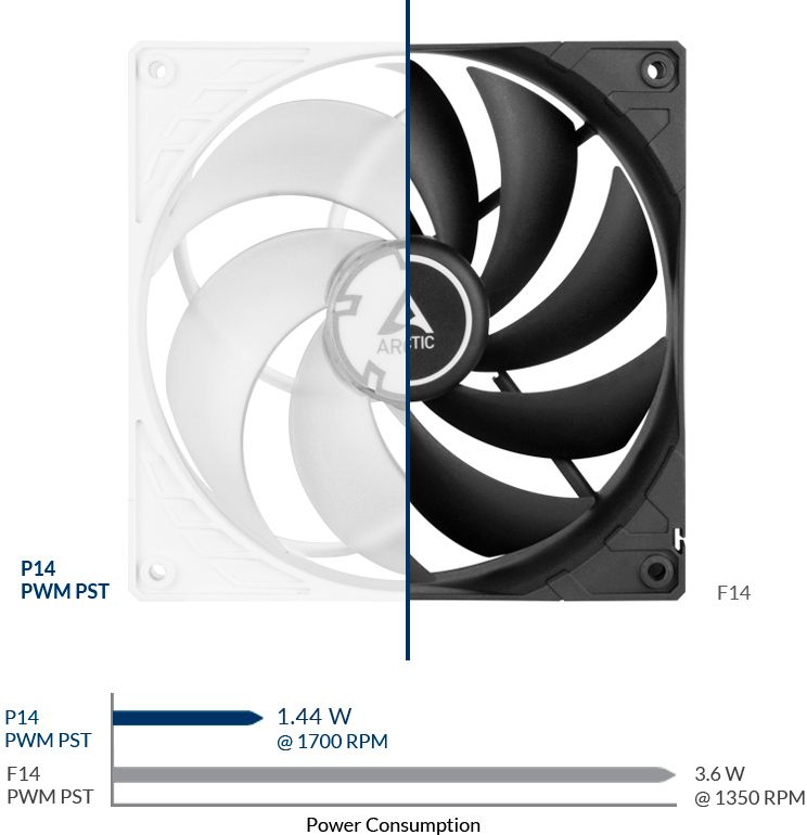 Silnik napędzany jest pierścieniem Neodym-Iron-Boron-Magnet najnowszej generacji, który pozwala nowemu P14 PWM PST pracować znacznie wydajniej niż jego poprzednicy. Oszczędza to energię i obniża temperaturę cewki bez pogarszania wydajności. Nawet przy niskich prędkościach dźwięk pracy nowego silnika ARCTIC jest ledwo słyszalny. Ze względu na magnesowanie sinusoidalne nowy silnik wytwarza tylko około 5% wibracji z komutacji zwykłego silnika prądu stałego bez filtra. W związku z tym nie ma potrzeby stosowania gumowych podkładek dystansowych ze względu na stały i płynny moment obrotowy nowego silnika.