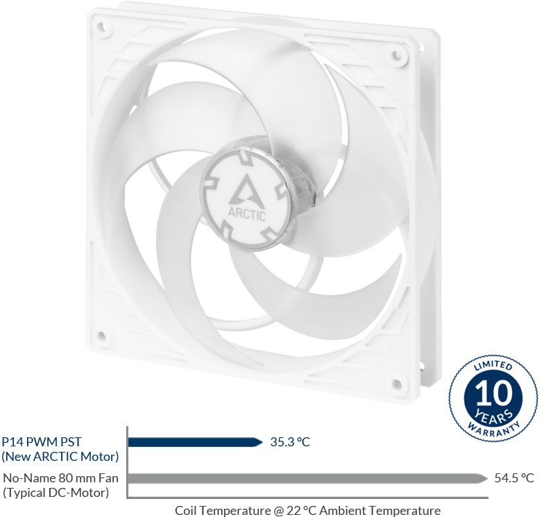 Niższa o 10 °C temperatura silnika w przybliżeniu podwaja żywotność wentylatora. Nowy silnik ARCTIC ma czterokrotnie dłuższą żywotność dzięki niskiej temperaturze cewki. W związku z tym wydłużyliśmy gwarancję do 10 lat.