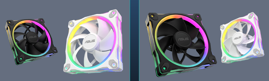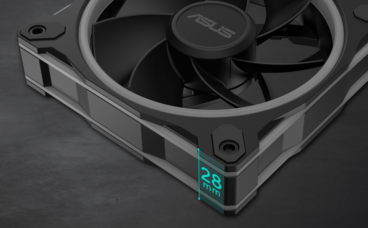 Wentylator ASUS Prime MR120 ARGB zapewnia silny przepływ powietrza i stałą wydajność chłodzenia, dzięki ramce o grubości 28 mm.