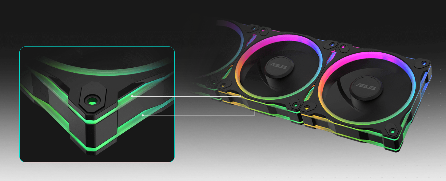 Dwustronne oświetlenie ramki wentylatora stylowo rozświetla obudowę. Kiedy zainstalujesz kilka wentylatorów obok siebie, rozszerzone oświetlenie tworzy żywy wygląd, który znacząco podnosi ogólny design Twojego systemu.