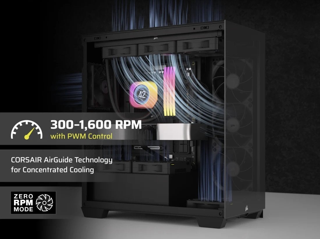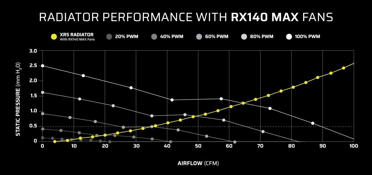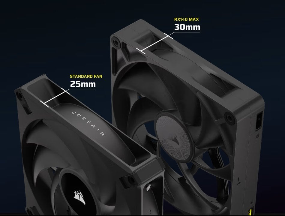 Wentylatory RX MAX zostały stworzone przez specjalistów firmy CORSAIR, którzy maksymalnie wykorzystali wszystkie zalety ich grubszej obudowy. Większe łopatki wentylatora o zoptymalizowanym kształcie przepychają większą ilość powietrza przez obudowę komputera. Wysokie ciśnienie statyczne czyni RX MAX idealnym wyborem do montażu na radiatorze, ponieważ model ten jest w stanie przepychać powietrze przez gęste przeszkody. Wentylatory RX MAX charakteryzują się znacznie mniejszym hałasem, ponieważ pracują przy niższej liczbie obrotów na minutę w porównaniu do tradycyjnych wentylatorów, zapewniając jednocześnie taki sam przepływ powietrza.