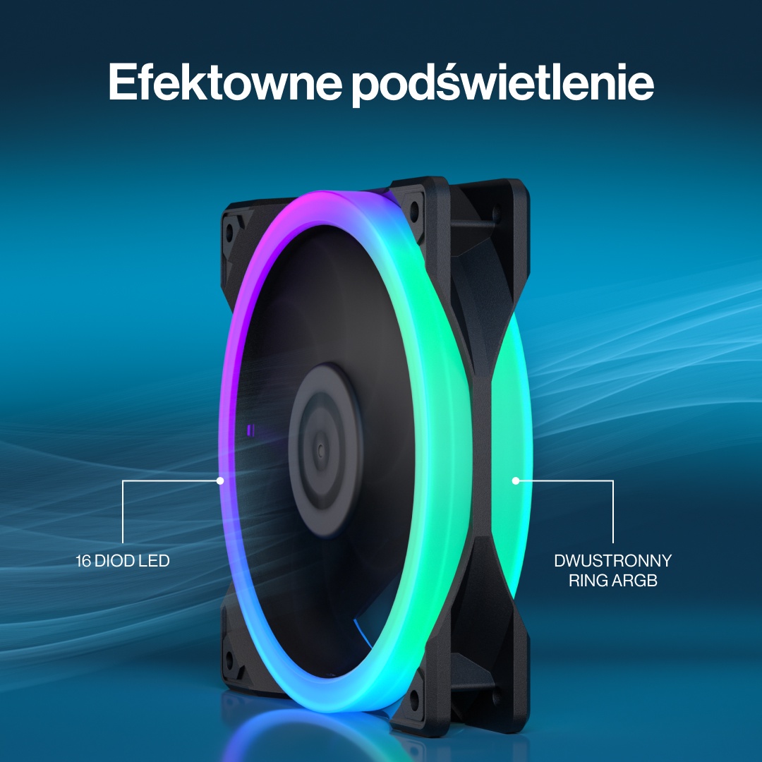 Corona 120 została wyposażona w efektowny pierścień ARGB, który podświetla wentylator z obu stron. Dzięki temu iluminacja jest widoczna niezależnie od kierunku montażu i umiejscowienia w obudowie komputera. Płynne przejścia kolorów i szerokie możliwości personalizacji efektów świetlnych pozwalają dopasować wygląd LED do własnego stylu.