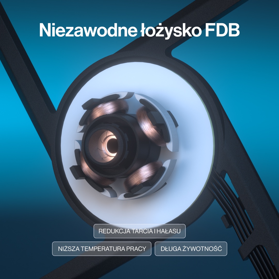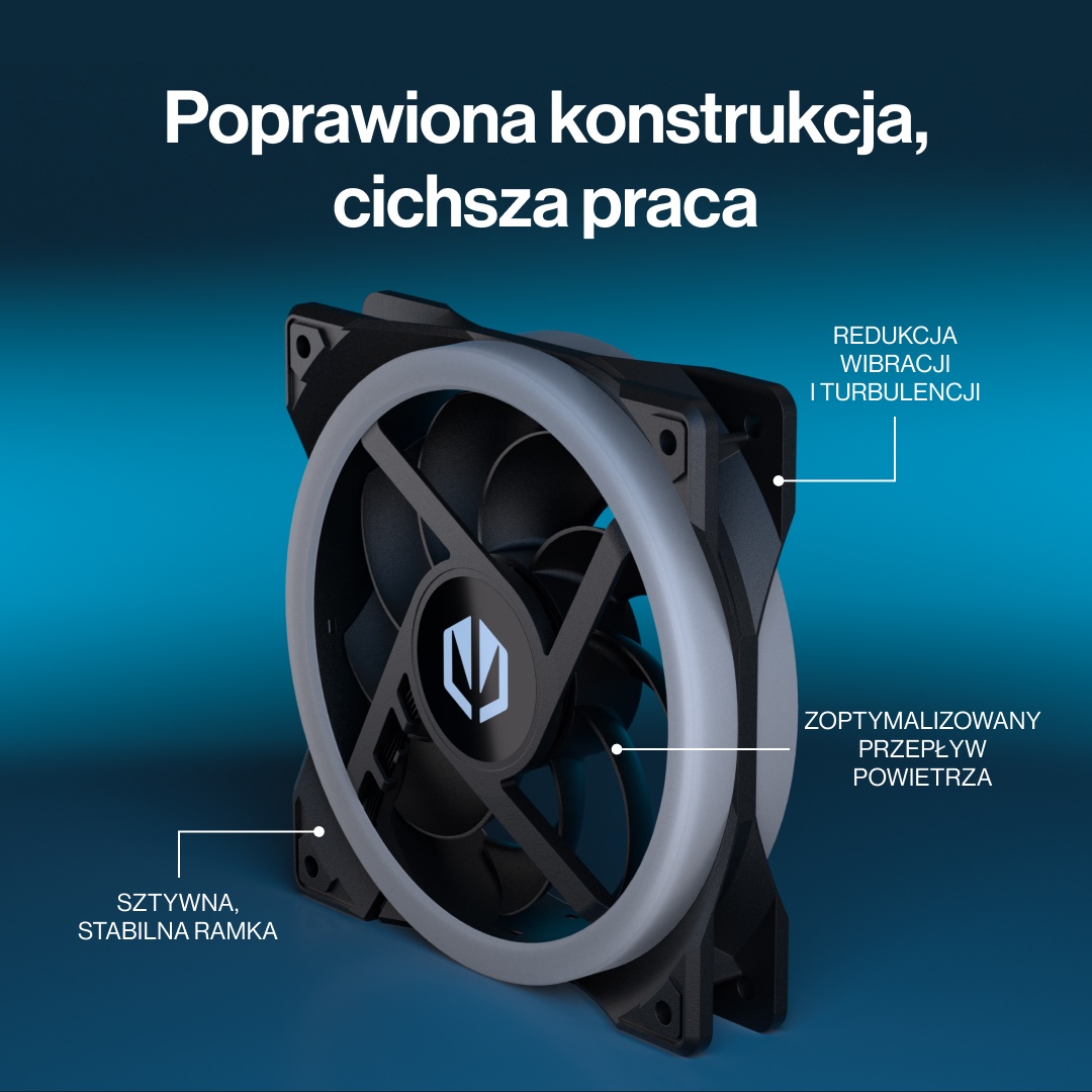 Przemyślana konstrukcja ramki oraz odpowiednio zaprojektowane kanały przepływu powietrza ograniczają wibracje i turbulencje. W efekcie wentylator pracuje płynnie i cicho, nawet przy wyższych prędkościach. To dobre rozwiązanie do zestawów, w których liczy się komfort akustyczny bez kompromisów wydajności.