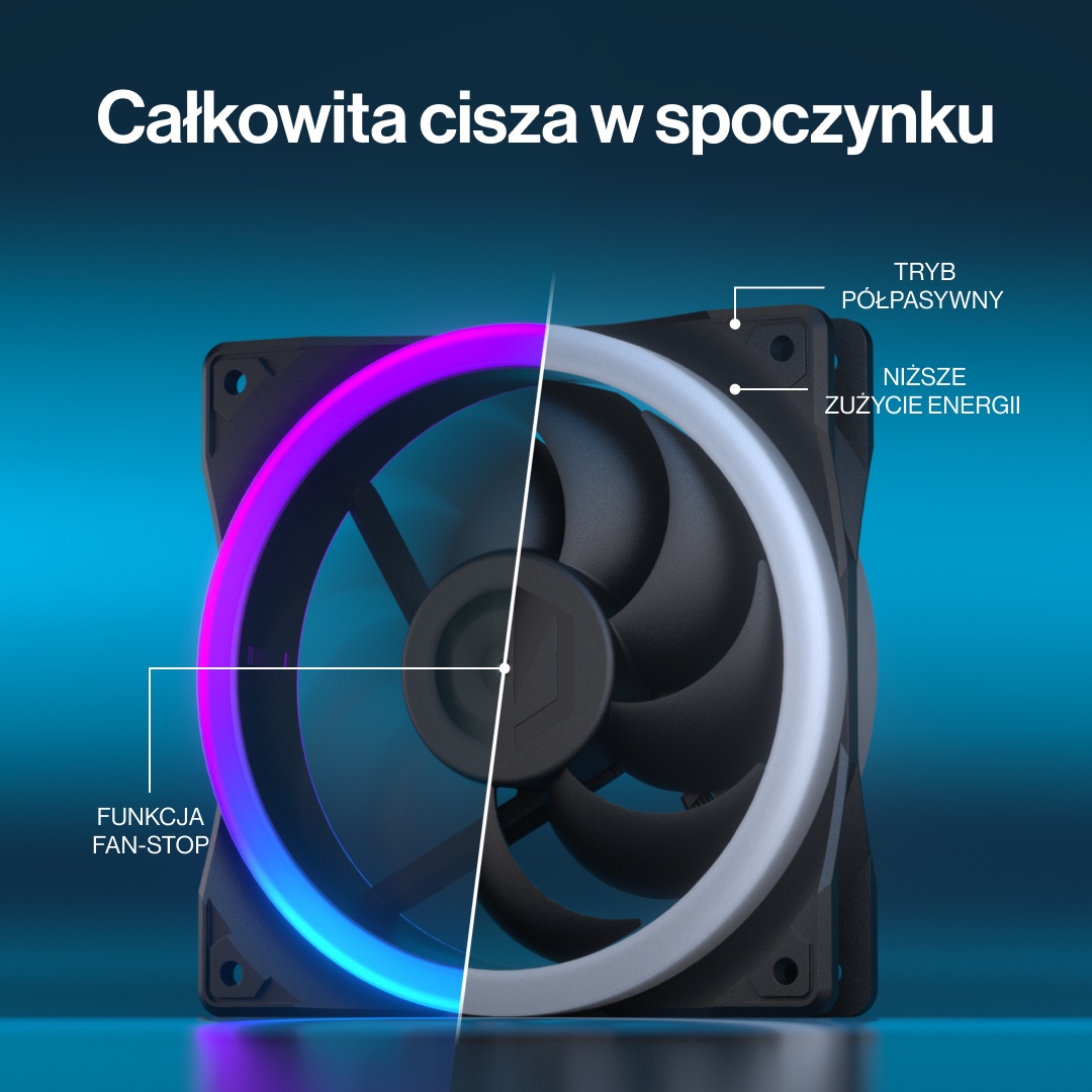 Wentylator może całkowicie zatrzymać się przy niskim poziomie sygnału sterującego, co umożliwia stworzenie półpasywnego systemu chłodzenia. W praktyce oznacza to brak hałasu podczas codziennych, lekkich zadań, takich jak oglądanie prostych treści w internecie czy praca biurowa, przy zachowaniu pełnej gotowości do działania pod większym obciążeniem.