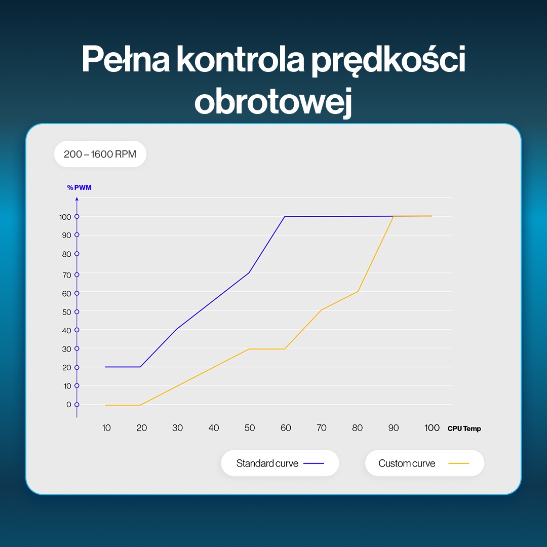 Dzięki technologii PWM prędkość obrotowa wentylatora może być precyzyjnie sterowana w zakresie 200–1600 obr./min. Pozwala to dostosować jego działanie do aktualnego obciążenia – od niemal niesłyszalnej pracy, gdy system nie jest obciążony – po maksymalną wydajność chłodzenia w wymagających momentach działania komputera.