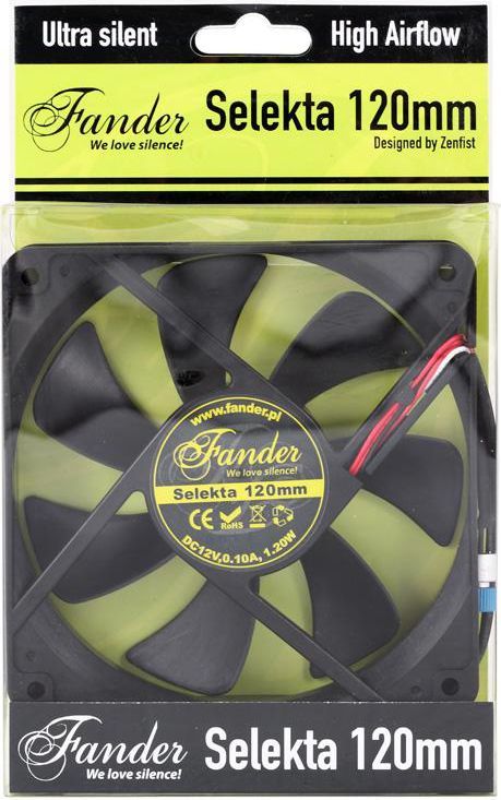 | Rodzaj łożysk (opis) | Wentylatory Fander Selekta 120mm korzystają z opracowanego, na potrzeby Fander łożyska Fluid Barometric Bearing, będące hybrydą łożyska ślizgowego i olejowego. |