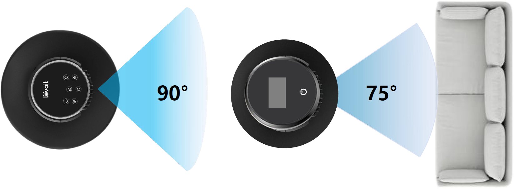 Dzięki szerokiemu zakresowi obrotu - aż 90 stopni - Levoit równomiernie rozprowadza chłodne powietrze po całym pomieszczeniu. To oznacza, że niezależnie od tego, gdzie siedzisz lub śpisz, możesz cieszyć się komfortowym nawiewem bez konieczności przestawiania urządzenia.