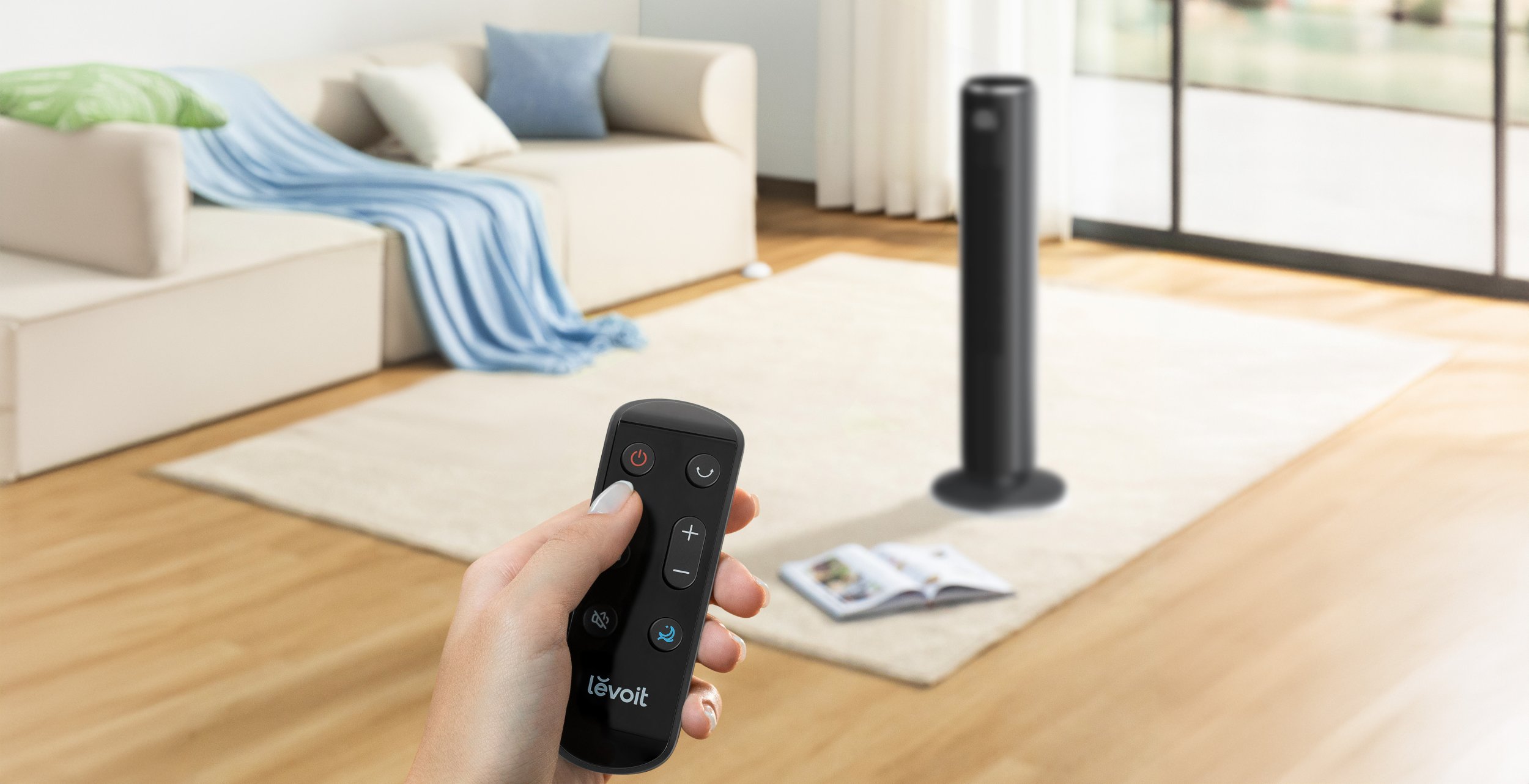 Steruj nawiewem z kanapy, łóżka czy zza biurka - za pomocą dołączonego pilota. Levoit TempSense 36 DC posiada wbudowany schowek na pilot z tyłu obudowy, dzięki czemu masz go zawsze pod ręką i już go nie zgubisz.