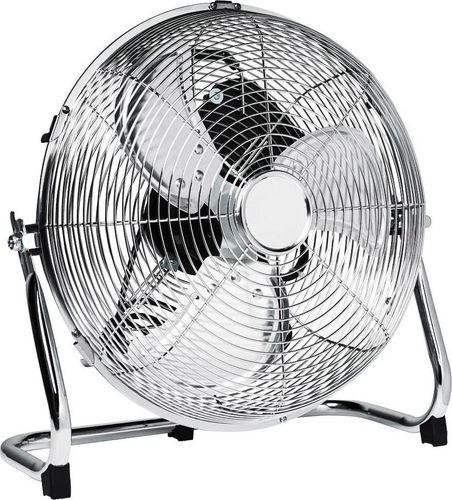 - Metalowy, chromowany, solidny wentylator podłogowy, do zastosowania w pomieszczeniach.