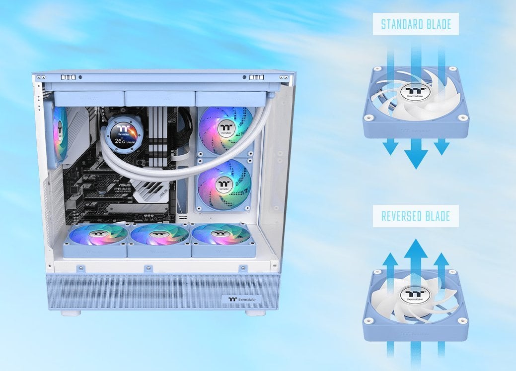 Wentylator z odwróconymi łopatkami umożliwia przepływ powietrza od tyłu do przodu, jednocześnie w pełni eksponując efekty świetlne. Już nie musisz rezygnować z estetyki na rzecz kierunku przepływu powietrza!