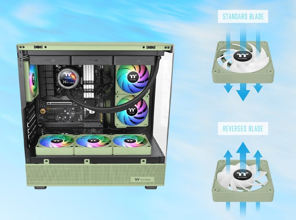 Wentylator z odwróconymi łopatkami umożliwia przepływ powietrza od tyłu do przodu, jednocześnie w pełni eksponując efekty świetlne. Już nie musisz rezygnować z estetyki na rzecz kierunku przepływu powietrza!