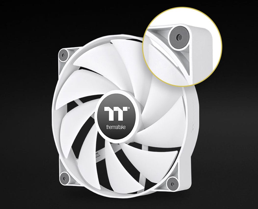 Na każdym z czterech rogów ramy umieszczono okrągłe podkładki antywibracyjne wykonane z gumy. Ich głównym zadaniem jest stabilizacja urządzenia oraz fizyczne tłumienie drgań, które mogłyby rezonować z obudową. Zapobiega to powstawaniu dodatkowych dźwięków podczas pracy wentylatora na wyższych obrotach.