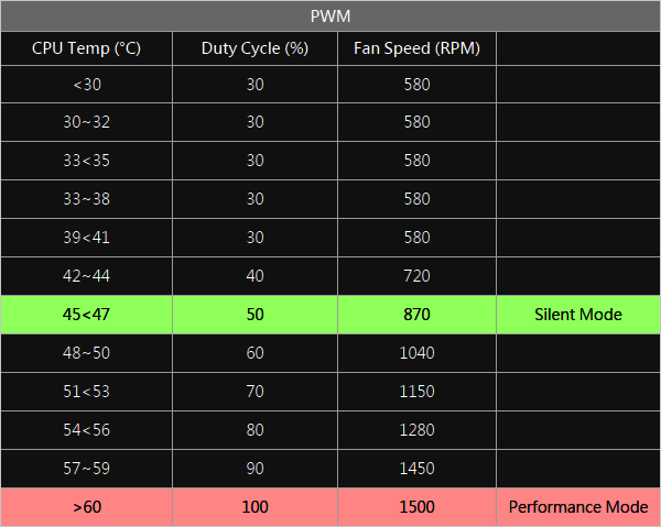 Wystarczy przeciągnąć suwak, aby dostosować prędkość obrotową wentylatora na dedykowanym panelu sterowania. Oprogramowanie zawiera również szereg gotowych trybów wentylatora, które umożliwiają ustawienie wentylatorów w „Tryb cichy”, w którym obroty osiągają zakres od 500 do 1500 obr./min, lub „Tryb wydajności”, który działa i dynamicznie dostosowuje się aż do 1500 obr./min. Oprócz pracy w optymalnym zakresie obrotów, możesz dostosować prędkość, wyłączając PWM.