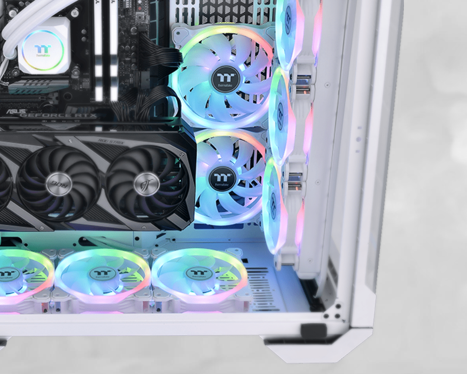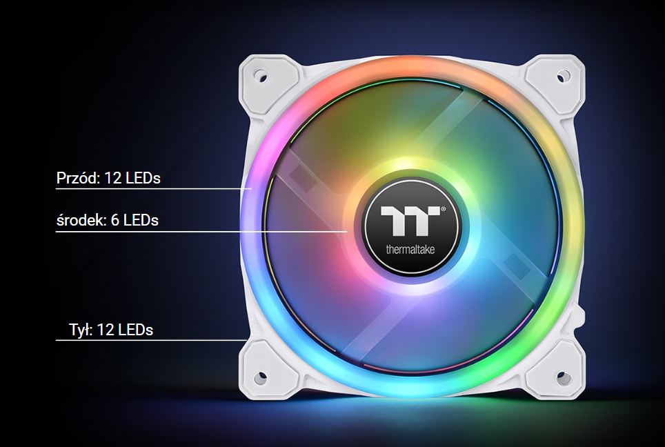 Koniec z poświęcaniem estetyki dla kierunku przepływu powietrza; SWAFAN może teraz zrobić jedno i drugie! Trzy niezależne pierścienie LED z 30 diodami LED umożliwiają tworzenie własnych wzorów świetlnych za pomocą oprogramowania TT RGB PLUS 2.0.