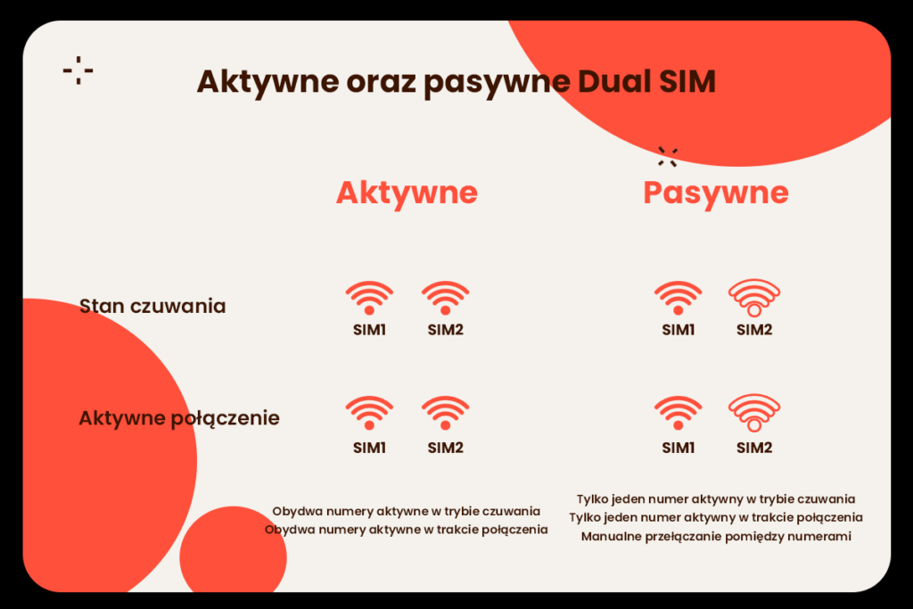 Pasywny Dual SIM to przypadek, w którym użytkownik musi ręcznie przełączać się pomiędzy kartami, aby korzystać z danego numeru. Bardzo niewygodne, ale też już archaiczne rozwiązanie – teraz najczęściej spotyka się Dual SIM Standby oraz Active.