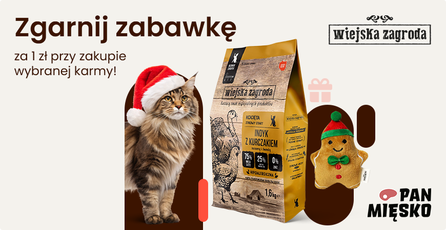 Promocja nie obejmuje produktów marketplace. Akcja trwa od 16 grudnia do 31 grudnia 2025 r. lub do wyczerpania zapasów. Promocja nie łączy się, a zabawka jest ściśle przypisana do rodzaju zakupionego produktu: kupując karmę dla psa, otrzymasz za 1 PLN zabawkę dla psa, a kupując karmę dla kota, otrzymasz za 1 PLN zabawkę dla kota. Więcej informacji znajdziesz w regulaminie promocji.