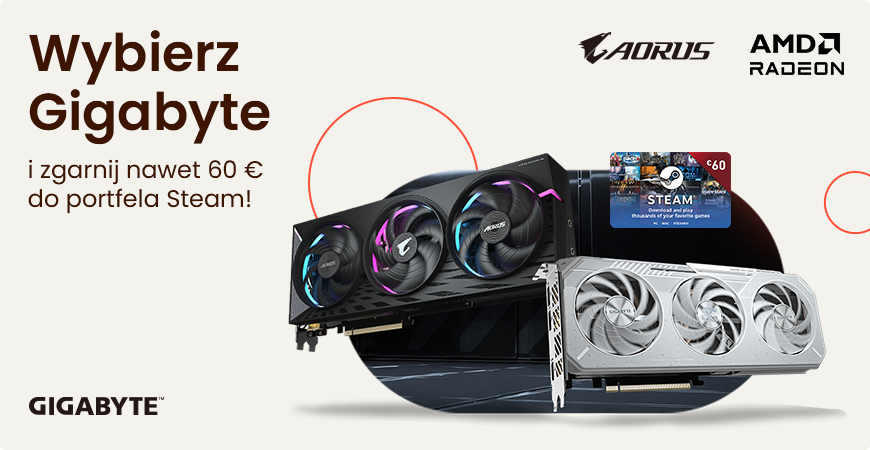 Wybierz nową kartę Gigabyte i zyskaj do 60 euro do portfela Steam. Sprawdź listę modeli objętych promocją i zgarnij dodatkowe środki na gry już teraz!