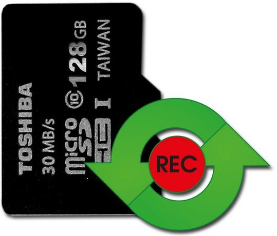 ![]() | Kamera obsługuje karty microSD/SDHC/SDXC o pojemności nawet 128 GB (rekomendowane karty minimum klasy 10/UHS1)), a w przypadku zapełnienia karty pamięci, rejestrator automatycznie zacznie nadpisywać najstarszy materiał filmowy z wyłączeniem materiałów zabezpieczonych.