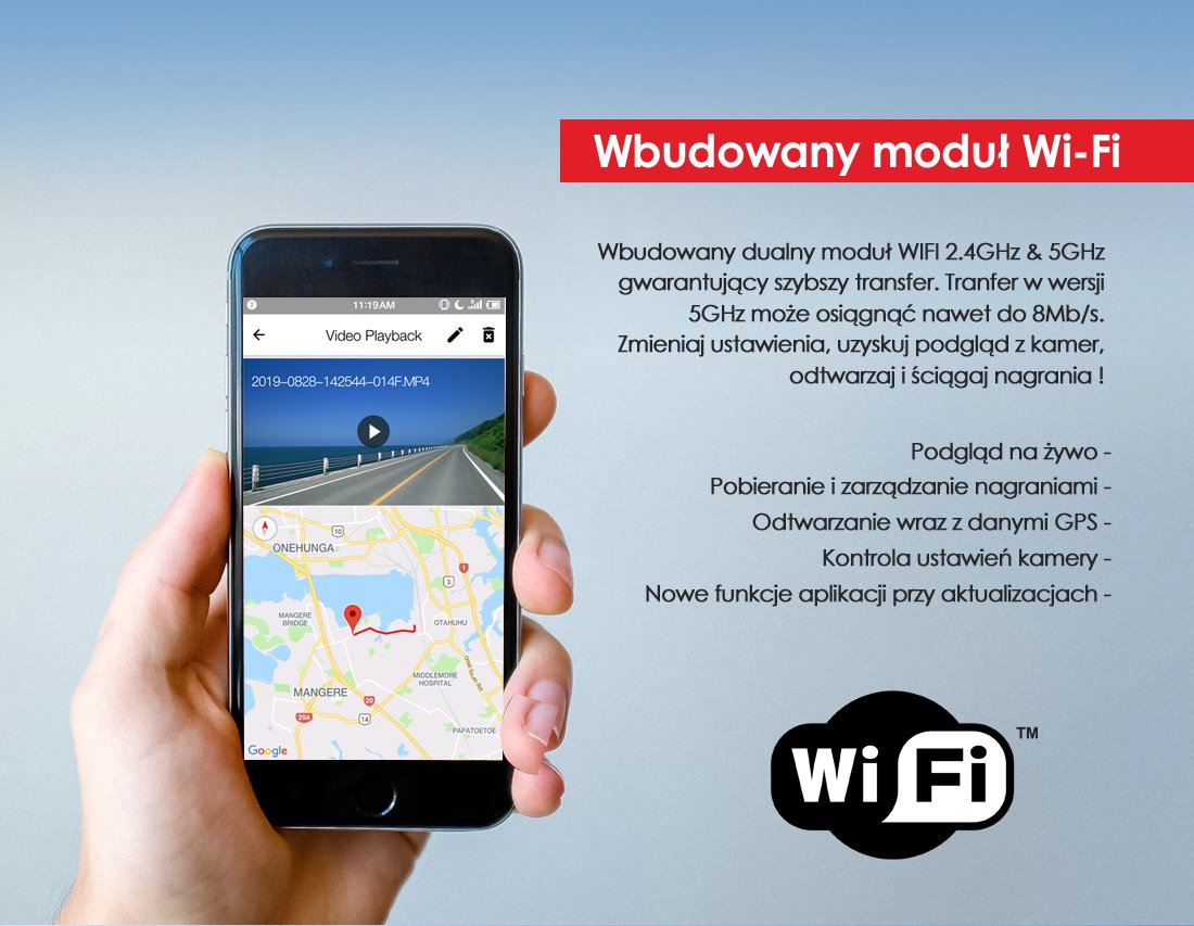 VIOFO A129 PRO posiada wbudowany zaawansowany moduł Wi-Fi pracujący w pasmach 2.4Ghz oraz 5Ghz. Umożliwia to dostęp do kamery np. ze smartfona dzięki darmowej aplikacji iOS/Android o nazwie VIOFO. Dodatkowo kamera posiada moduł Bluetooth, który umożliwia sparowanie przycisku zabezpieczającego nagranie (opcjonalne akcesorium).