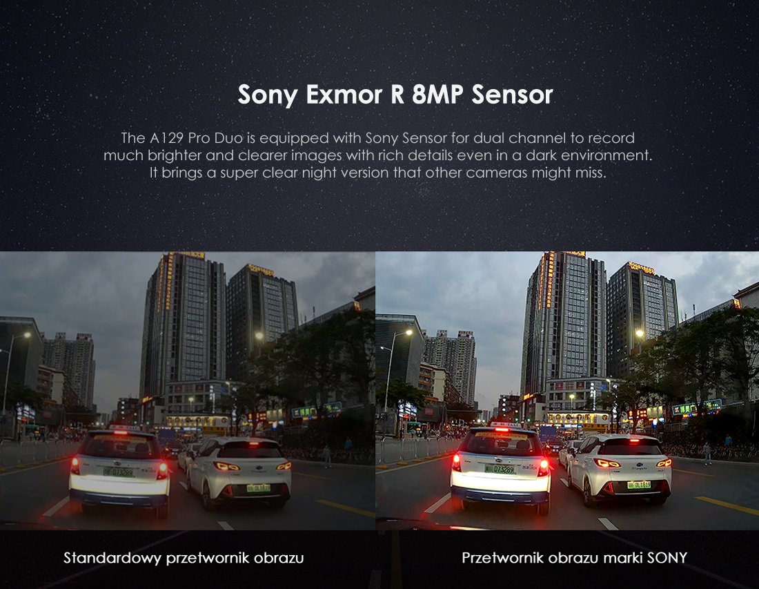 Kamera Viofo A129 PRO została wyposażona w matryce marki SONY. W kamerze znajduje się matryca Sony R IMX317 8MPX – takie rozwiązanie pozwala na "tryb noktowizji" w całkowitej ciemności.