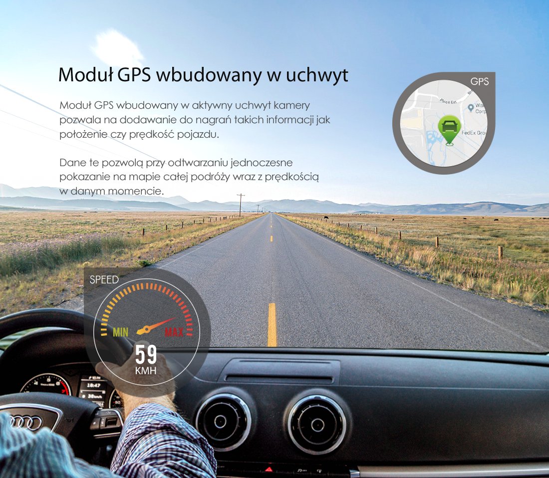 Dzięki niewielkim wymiarom oraz uchwytowi-naklejce, kamera VIOFO A129 PRO idealnie przylega do szyby, dzięki czemu jest dyskretna i nie przesłania widoku kierowcy. Dodatkowo, w uchwycie kamery ukryto moduł GPS – przez ten uchwyt można zasilać kamerę.