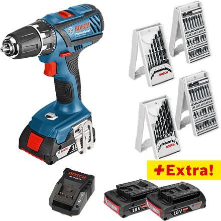 Wiertarko-wkrętarka GSR 18-2Li 18V 2 x 2Ah + 63-częściowy zestaw akcesoriów w walizce (0615990H27)