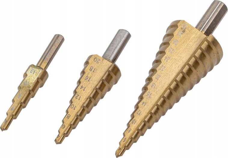 W skład zestawu wchodzą trzy wiertła stopniowe: