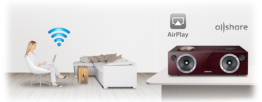 Dzięki aplikacjom Samsung AllShare Play i Airplay odtwarzanie ulubionych utworów stało się teraz jeszcze prostsze. Dostęp do bezprzewodowej transmisji danych umożliwia łączenie ze sobą urządzeń i odtwarzanie muzyki bezprzewodowo i bezproblemowo zarówno w przypadku urządzeń Samsung Galaxy, jak i Apple. Wbudowana karta Wi-Fi eliminuje ograniczenia związane z miejscem użytkowania systemu, zapewniając pełną swobodę dostępu do muzyki bez dokowania urządzenia. W ten oto sposób muzyka znajduje się zawsze w zasięgu ręki.