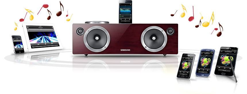 Bezprzewodowy system audio ze stacją dokującą Samsung to składnik Twojego centrum rozrywki, na którym możesz polegać. Jest to pierwszy na świecie bezprzewodowy system audio z hybrydową stacją dokującą, która umożliwia odtwarzanie muzyki z wielu urządzeń przenośnych, w tym z telefonów Samsung Galaxy S II, Galaxy S III i Galaxy Note oraz z innych produktów, takich jak iPhone, iPod czy iPad. Taka wszechstronność ułatwia konfigurację systemu audio oraz eliminuje wiele problemów związanych z koniecznością wprowadzania dodatkowych składników pasujących do danego urządzenia przenośnego.