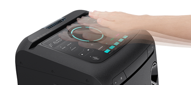 System obsługi gestami umożliwiający zmienianie ustawień zabawyDo rozkręcenia imprezy wystarczy jeden prosty ruch. Ciekawy i intuicyjny system sterowania gestami daje kontrolę nad wszystkimi funkcjami, w tym podświetleniem, a także efektami DJ i mikrofonowymi. Wykonuj gesty w lewo lub w prawo, aby omijać utwory, albo w górę lub w dół, aby zmieniać głośność. Dopasowywanie imprezy do własnych upodobań nigdy nie było równie przyjemne. | Pełna swoboda słuchania nagrań w różnych pomieszczeniach dzięki funkcji bezprzewodowejJeśli chcesz, żeby w całym domu towarzyszyła Ci muzyka, skorzystaj z funkcji bezprzewodowego odtwarzania w wielu pomieszczeniach, której obsługę umożliwia aplikacja Sony | Music Center (poprzednio SongPal). Pozwala ona łączyć w grupy wybrane głośniki i listwy głośnikowe Sony. W trybie Group wszystkie głośniki będą odtwarzać tę samą muzykę. W trybie Single można natomiast zdecydować, co ma grać każdy z poszczególnych głośników. | Kółka i uchwyt zapewniają przenośnośćSystem MHC-V77DW został skonstruowany z myślą o łatwym transporcie, więc możesz zabierać ze sobą zachwycający dźwięk, gdziekolwiek się udajesz. |