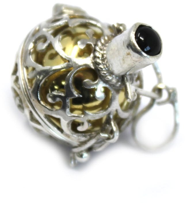 Wisiorek z dzwoneczkiem – Czas nocy. Średnica 18 mm. Srebro próba 925. Te wyjątkowo piękne, srebrne wisiorki – dzwoneczki wykonane zostały na wyspie Bali, u podnóża góry Ubud. Wyspa słynie z wyjątkowych i pięknych projektów biżuterii. Łączą tradycyjne techniki takie jak granulacja, filigran i repusowanie i materiały z nowoczesnymi stylami. Często włączają do swoich projektów tradycyjne, skomplikowane detale i wzory, takie jak Barong, Garuda i kwiat lotosu.