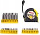 W skład zestawu wchodzi szeroki wachlarz narzędzi, które umożliwiają realizację wielu zadań. Znajdziesz tu nasadki 1/4" w rozmiarach od 5 do 13 mm, magnetyczny adapter do bitów, młotek o wadze 350 g, kombinerki 6”, klucz nastawny szwedzki 8”, nożyce techniczne 8”, nóż tapicerski oraz miarę zwijaną 3 m. Dodatkowo, zestaw zawiera wkrętak akumulatorowy, idealny do lekkich prac w domu.