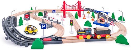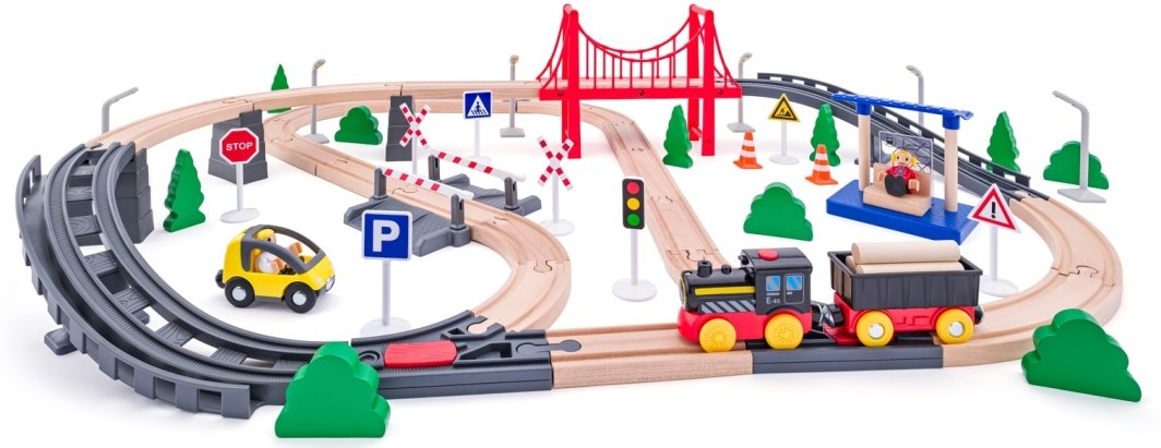 Wielopoziomowa konstrukcja kolejki z mostem linowym zachęca dzieci do projektowania własnych tras i scenariuszy zabawy. Długość torowiska wynosząca 260 cm umożliwia rozbudowę i modyfikację torów, co sprawia, że każda zabawa może być unikalna. Dzieci mogą bawić się samodzielnie lub w towarzystwie rówieśników, co sprzyja rozwijaniu umiejętności społecznych.