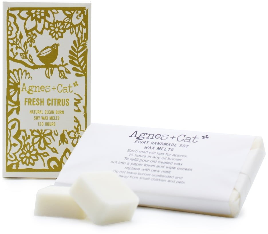 Wosk zapachowy – Świeże cytrusy,8 sztuk. Wypełnij dom zapachem dzięki woskom sojowym Agnes+Cat. Silnie pachnące kostki są świetną alternatywą dla świec. Produkowane ręcznie w Sheffield przy użyciu naturalnego wosku sojowego z Indonezji oraz wysokiej jakości brytyjskich olejków zapachowych oraz eterycznych.