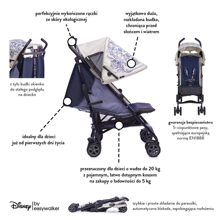 Ikona styluZachowując nowoczesny wygląd i prosty styl, wózek Disney by Easywalker wyróżnia się bajkowym designem. Jako wózek miejski i terenowy nie tylko zapewni komfort Twojemu dziecku, ale sprosta także wszystkim Twoim oczekiwaniom. | ![]() |
