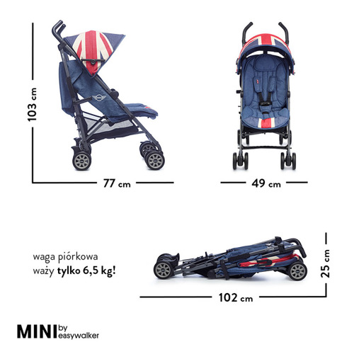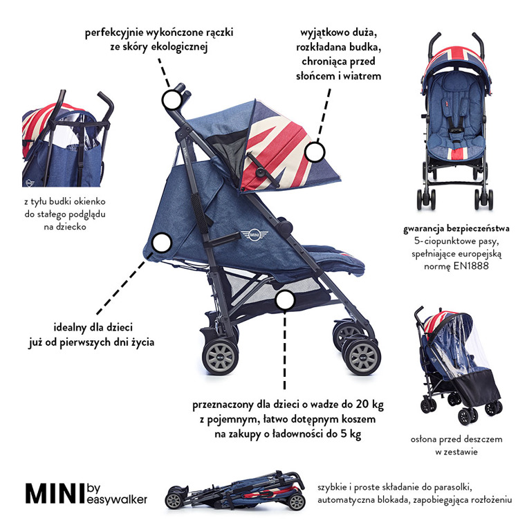 Wózek jest częścią większej kolekcji MINI. W zależności od potrzeb można wyposażać go w stosowne akcesoria tej samej marki i linii, m. in. pałąk-uchwyt dla rączek, adapter do fotelika, tackę i inne. W 2017 r. drugi rok z rzędu wózek MINI by Easywalker zdobył tytuł „Best in Test”, przyznawany przez europejską organizację konsumencką. Dane techniczne: