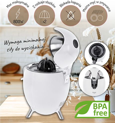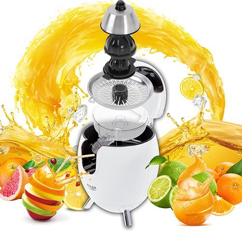 Pozwala na sprawne przygotowanie świeżego soku z cytryn, pomarańczy i grejpfrutów. Pokrywa ochronna zapobiega rozpryskiwaniu się soku po stole lub blacie kuchennym. Wyciskarka posiada 2 stożki wyciskające, odpowiednie dla owoców o różnej średnicy. Urządzenie składa się stabilnej podstawy, przykrywki, sitka oddzielającego sok od miąższu oraz dwóch wymiennych stożków wyciskających. Sitko gwarantuje płyn bez pływających w nim cząstek i pestek z owoców. Natomiast stożki ułatwiają wyciskanie soku z mniejszych i większych cytrusów, co ma szczególne znaczenie, jeśli jesteśmy miłośnikami soków grejpfrutowych. Wygoda i prostota użytkowania produktu sprawią, że będzie to idealny zakup dla każdego, kto ceni zdrowe odżywianie i świeże nieprzetworzone soki jako uzupełnienie diety. Elegancki wygląd i możliwość mycia wyjmowanych części w zmywarce czynią ją idealną do każdego rodzaju kuchni. Dzióbek pozwala wyciskać sok bezpośrednio do szklanki z herbatą lub na sok.